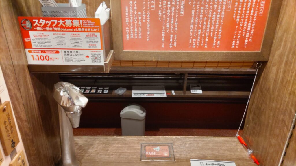 なんで、こんな狭いところで小さくなってラーメンくわにゃいけんのか?と思ってしまいますが、目の前の説明書きを読みながら、出てきたラーメンをいただくわけですよ。