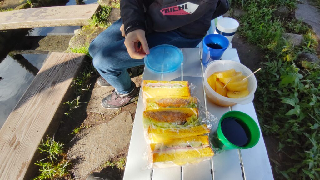 暑いので足をつけるようになっているのかわかりませんが、水源なので非難を浴びるようなことは慎もうと思い何もしませんでしたが、ここで朝食をいただきます。