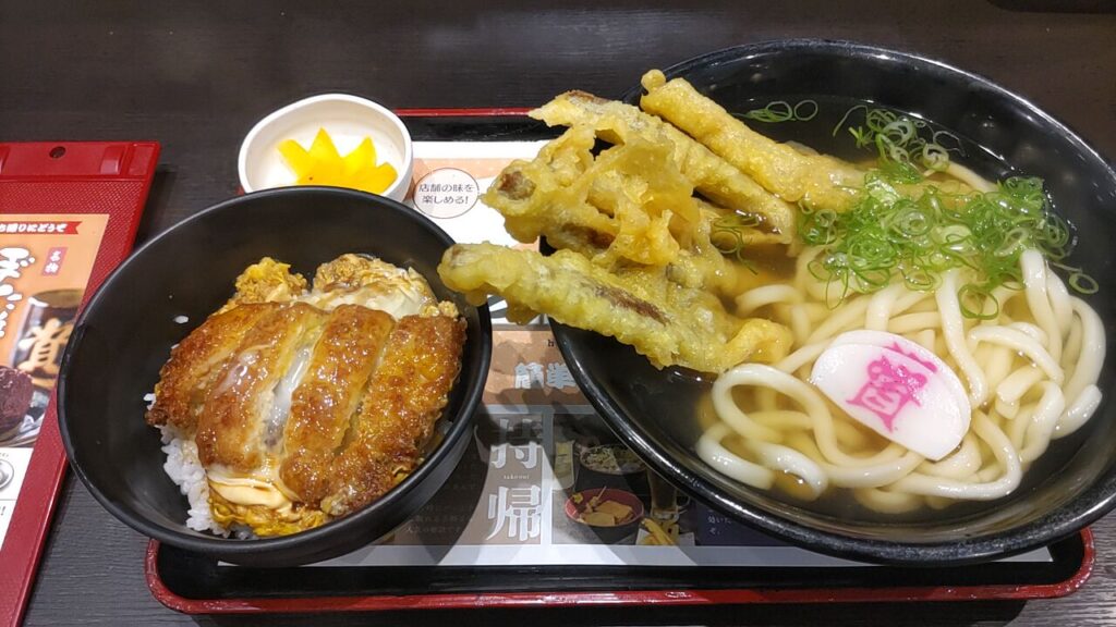 走った後は、資さんで昼食です。嫁は炭水化物でお腹を満たすのが嫌いなので、いないときにコッソリ食べに行ってます。今日はごぼ天うどんとミニカツ丼のセットです。