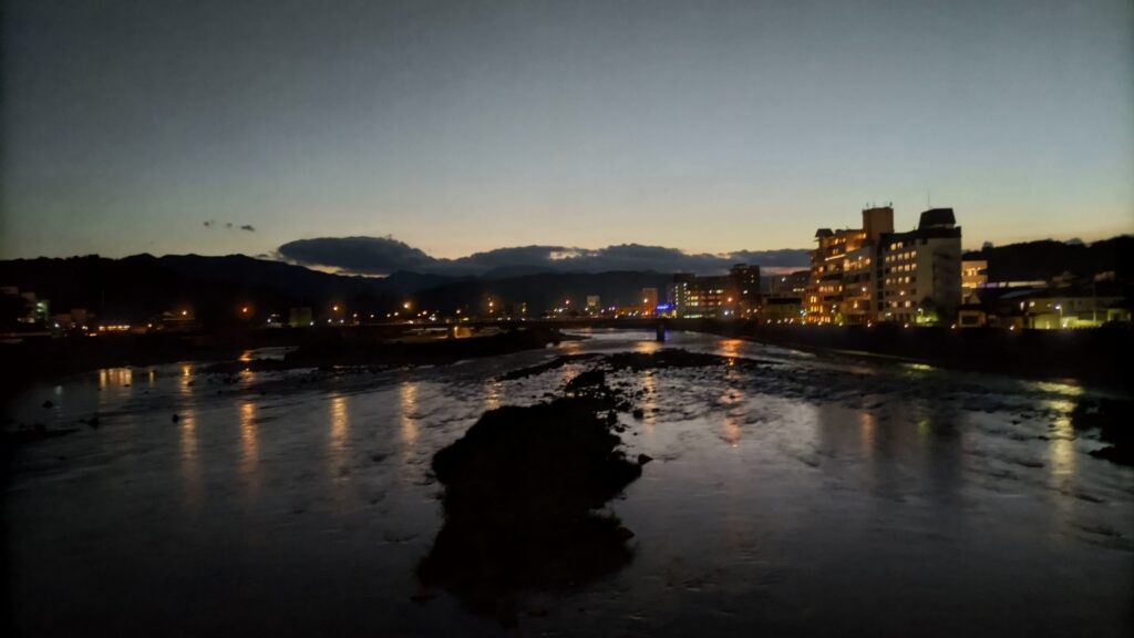 それから旅館にチェックインして、夕食を食べてから川辺をうろつきます。