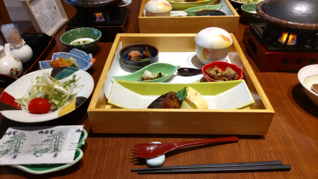旅館の朝ご飯は豪華ですね。嫁が米を私に食わせるので、朝から腹いっぱいです。