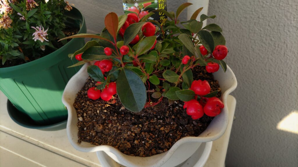 先週ついでに買ったチェッカーベリーは実がリンゴっぽくて可愛いですね。鉢がちょっと大きすぎて実が腐りそうな気がしますが・・・。