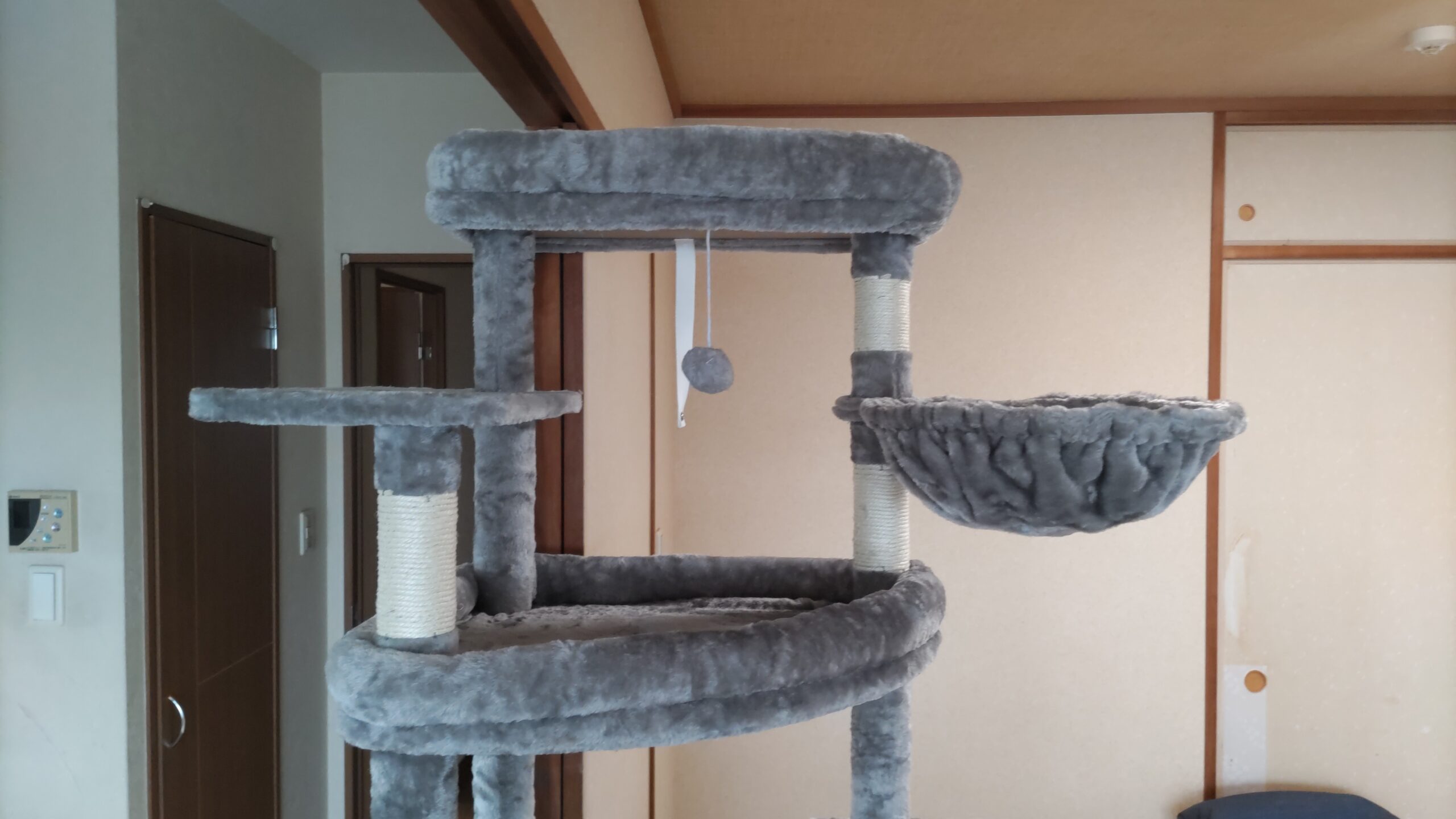 多頭飼用の大きいタワーで、2mくらい高さがあって、きっともちこさんが喜んでくれると思ったのですが、ビビりなのでまだ使ってくれません・・・。