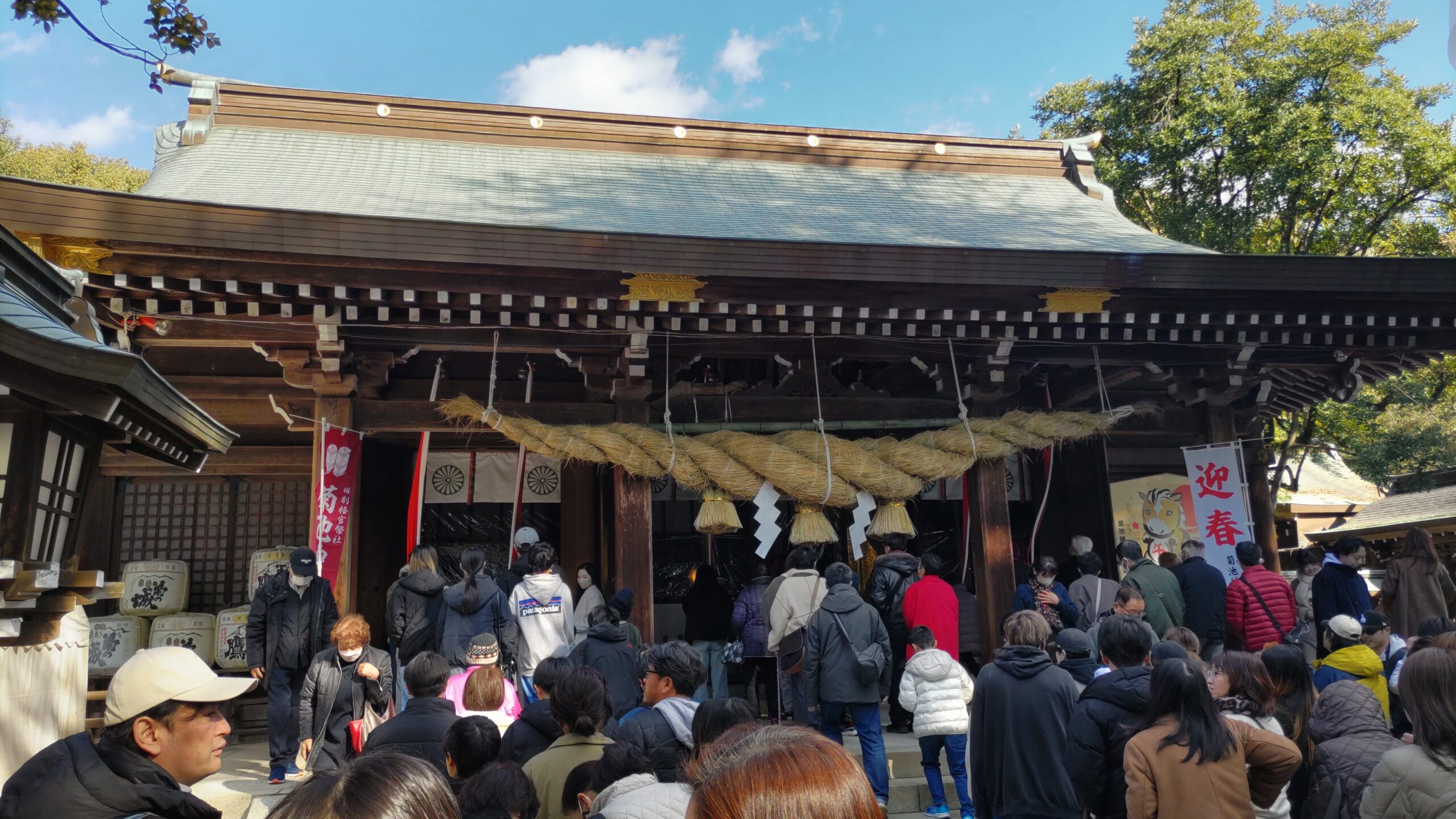 まずは、菊池神社に行ってみました。途中でいつものパン屋さんがなぜか正月から開いていたので立ち寄ってみると・・・、どうやらご主人が台湾の方なので、正月より旧正月のほうが正月らしいです・・・。お店の奥さんからそう説明され、常連の私たちは丁重に新年のご挨拶を受けたのでした・・・。