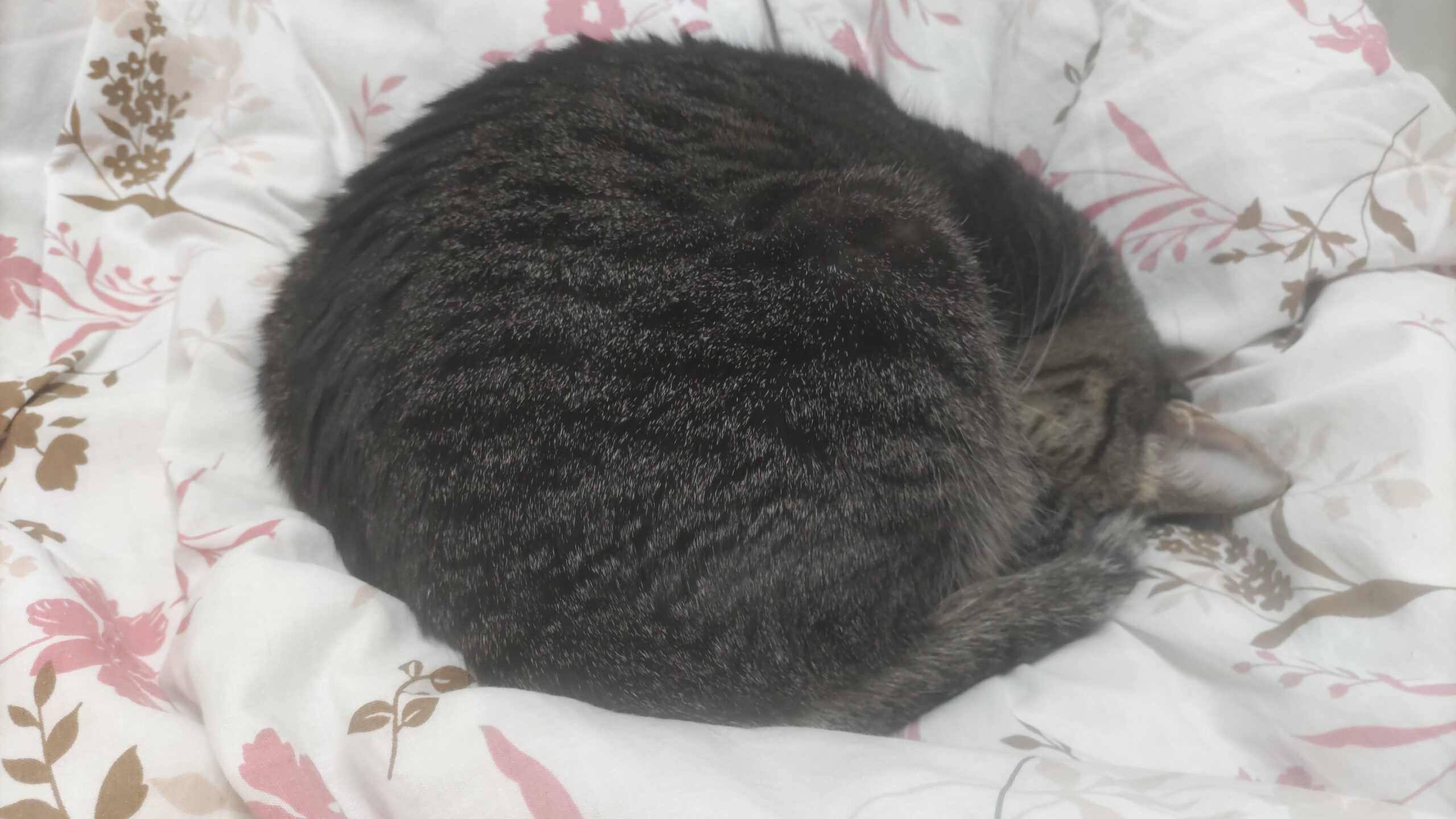 もちこさんは寒いので布団の上で丸く(アンモニャイトですね)なって寝ています。なぜか、私の足と足の間に埋まって寝たりするので、おちおち寝返りもできません。朝になると起こしに来るのですが、寒いので寝ている時間が長いような気がします。