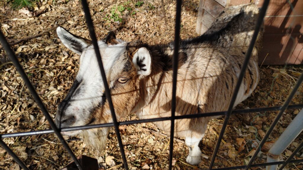 近くにヤギさんが一匹・・・、草がなくて枯れ葉なんかをモグモグしていました。