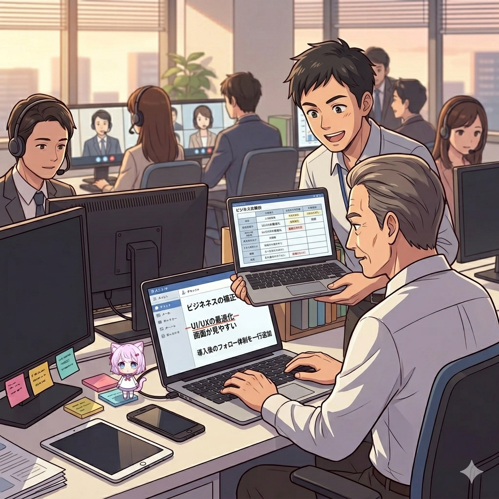 それでも私は、篠塚の画面の「UI/UX」を消して「画面が見やすい」に直したあと、比較表の順番まで少し入れ替えてやった。ついでに導入後のフォロー体制を一行追加しておく。先方が年配の社長なら、そこを見て安心する。